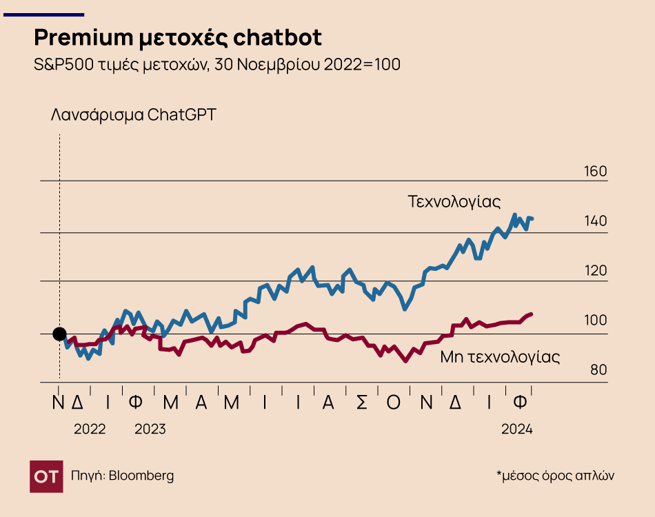 τεχνολογίας, τα αυξανόμενα έσοδα αρχίζουν να αντιστοιχούν στις ουρανοκατέβατες τιμές των μετοχών. Στις 21 Φεβρουαρίου η Nvidia, η οποία μεταξύ άλλων σχεδιάζει και τσιπ που χρησιμοποιούνται για την εκπαίδευση και την εκτέλεση μοντέλων όπως το GPT-4, ανακοίνωσε εξαιρετικά αποτελέσματα τέταρτου τριμήνου, στέλνοντας την αξία της αγοράς της προς τα 2 τρισεκατομμύρια δολάρια.