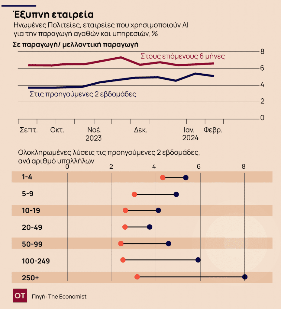 Όταν το Γραφείο Απογραφής άρχισε να ρωτάει για την τεχνητή νοημοσύνη τον Σεπτέμβριο του 2023, οι μικρές επιχειρήσεις ήταν πιο πιθανό να χρησιμοποιούν την τεχνολογία από τις μεγάλες, ίσως επειδή η λιγότερη συμπλήρωση εντύπων έκανε την υιοθέτηση ευκολότερη για τους μικρούς. Σήμερα η τεχνητή νοημοσύνη είναι πιο διαδεδομένη στις μεγάλες εταιρείες (με περισσότερους από 250 υπαλλήλους), οι οποίες μπορούν να αντέξουν οικονομικά να στρατολογήσουν ειδικές ομάδες τεχνητής νοημοσύνης και να πληρώσουν για τις απαραίτητες επενδύσεις. Μια δημοσκόπηση της Morgan Stanley σε μεγάλες επιχειρήσεις διαπίστωσε ότι μεταξύ της αρχής και του τέλους του 2023 το ποσοστό με πιλοτικά έργα AI αυξήθηκε από 9% σε 23%.