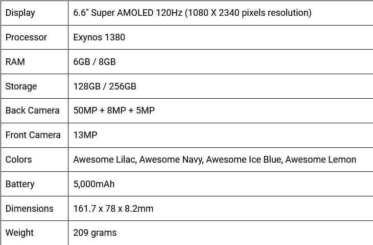Το τηλέφωνο διαθέτει πιστοποίηση IP67, ζυγίζει 209 γραμμάρια και πάχος 8,2 χιλιοστά. Το τηλέφωνο διαθέτει μια κομψή οθόνη Super AMOLED 6,6 ιντσών με ρυθμό ανανέωσης 120 Hz, τρύπα για selfie και ανάλυση 1080 x 2340. Ο επεξεργαστής είναι ο Exynos 1380 και προσφέρεται είτε με 6GB είτε 8GB RAM και 128GB ή 256GB αποθηκευτικού χώρου. ανάλογα με τη διαμόρφωση ενώ έχει μπαταρία 5000mAh. Το τηλέφωνο θα είναι προεγκατεστημένο με One UI 6.1, το οποίο βασίζεται στο Android 14.