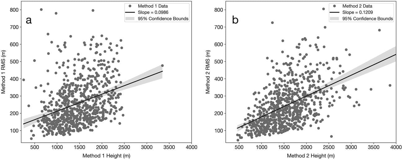 Το μικρότερο ηφαίστειο που εντοπίστηκε είχε ύψος 421 μέτρων. Τα περισσότερα ήταν ψηλότερα από 700 μέτρα και αρκετά ξεπερνούσαν τα 2.500 μέτρα από τον πυθμένα του ωκεανού.