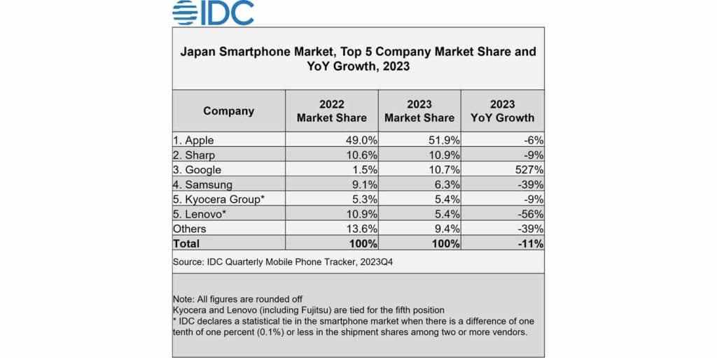 , η συνολική αύξηση σε ετήσια βάση της συνεισφοράς της Google για smartphone με το Pixel στην Ιαπωνία αυξήθηκε κατά 527%. Αυτό συμβαίνει καθώς οι περισσότεροι OEM με σημαντικό μερίδιο αγοράς μειώθηκαν σε ανάπτυξη από το 2022 έως το 2023, με τη Samsung να έχει τη μεγαλύτερη πτώση.