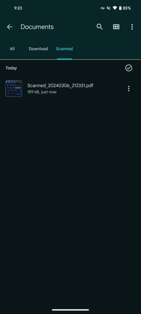 Μόλις ολοκληρωθεί, η σάρωση αποθηκεύεται ως PDF σε έναν νέο εσωτερικό χώρο αποθήκευσης > Αρχεία από την Google > Σαρωμένο φάκελο. Αυτός ο σαρωτής εγγράφων εμφανίζεται στο