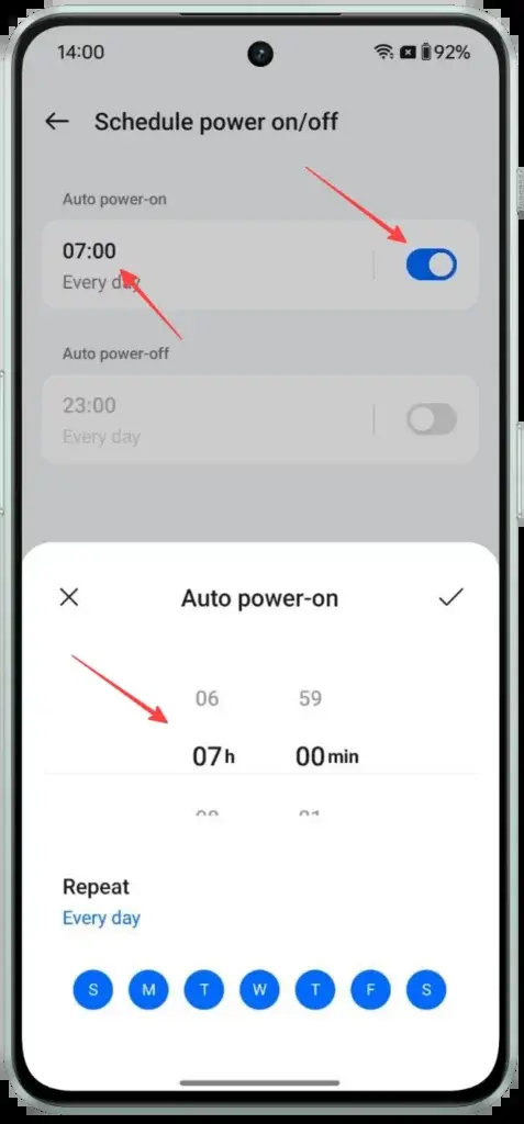 Στη συνέχεια, πατήστε στην εναλλαγή Auto Power On και ορίστε την ώρα που θέλετε να ενεργοποιείται η συσκευή σας.