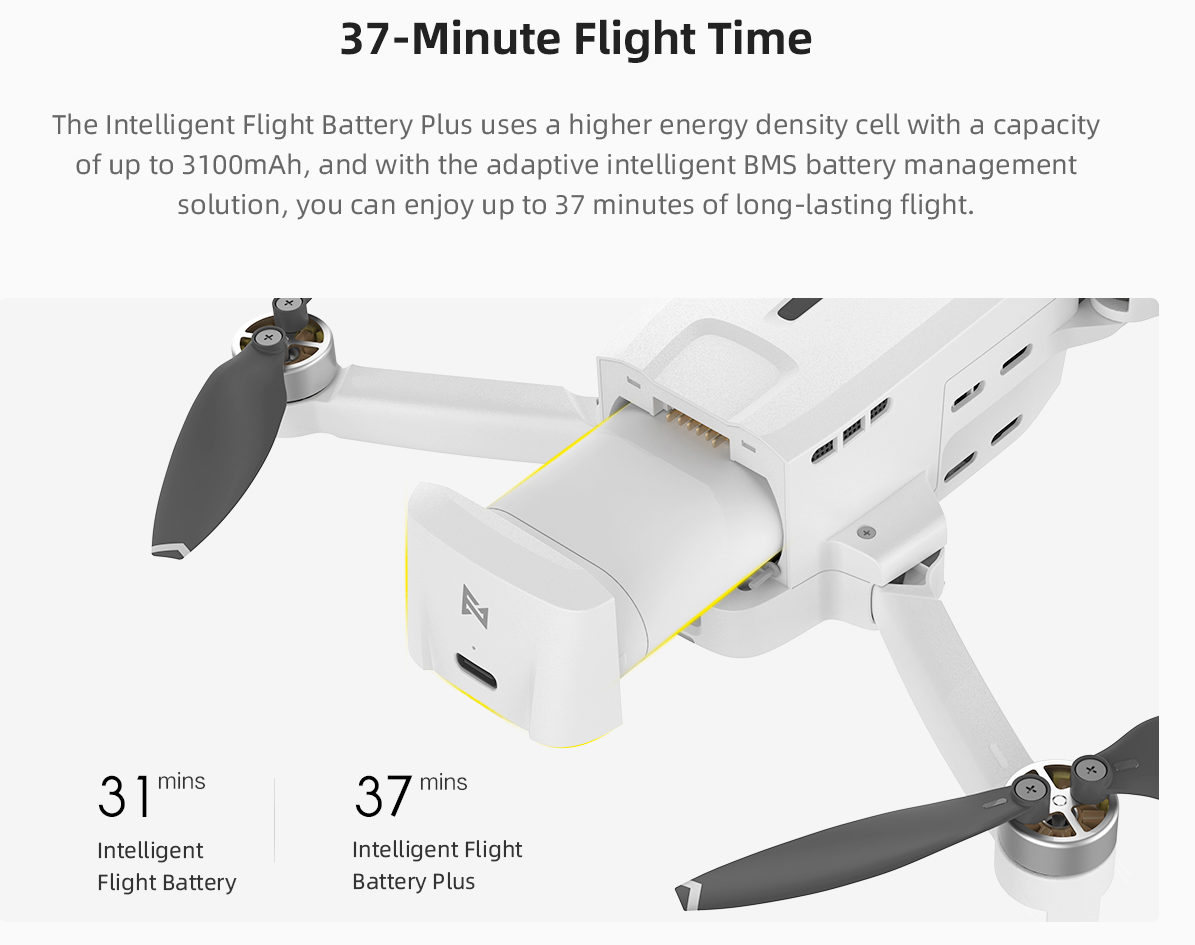 Η ενσωματωμένη μπαταρία της κατηγορίας Plus προσφέρει 3100 mAh και διάρκεια πτήσης έως και 37 λεπτά ανά φόρτιση. Το USB-C θα φροντίσει για τη φόρτιση.