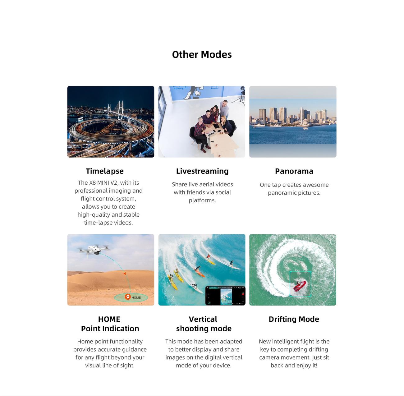 Το drone μπορεί να πετάξει σε ύψος έως και 4000 μέτρα, με μέγιστο άνεμο έως και 16 m/s. Διαθέτει συστήματα πλοήγησης GPS / Galileo / BeiDou και GLONASS, καθώς και σύνδεση με την εφαρμογή FIMI Navi για κινητά, η οποία προσφέρει αρκετές βελτιώσεις AI για τις λήψεις σας.