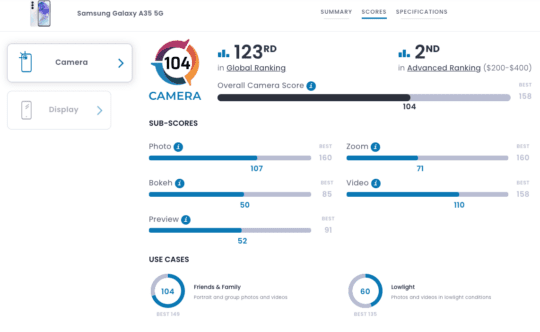 Σύμφωνα με τις βαθμολογίες του DxOMark, το Galaxy A34 – το 136ο τηλέφωνο με κάμερα στην παγκόσμια κατάταξη και 7ο στην κατηγορία των 200-400 $ – έχει καλύτερο ζουμ από το Galaxy A35.