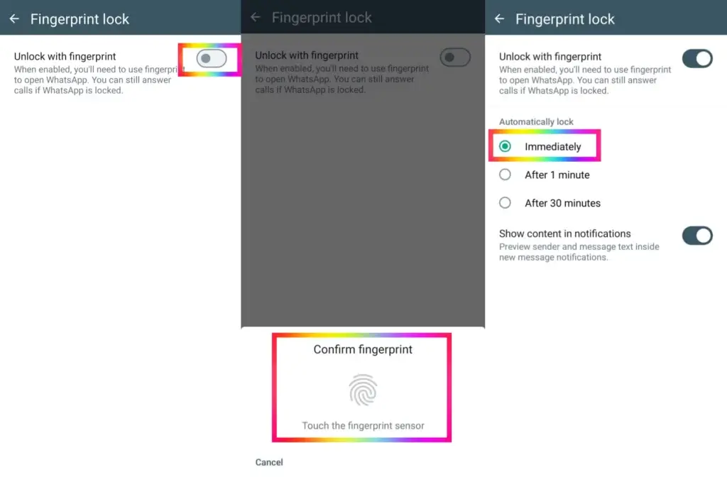 Αυτή η δυνατότητα προστατεύει την ασφάλεια της εφαρμογής και ενισχύει το απόρρητο. Λειτουργεί ως κλείδωμα εφαρμογής για την επιχειρηματική εφαρμογή WhatsApp. Εάν δεν διαθέτετε λειτουργία κλειδώματος εφαρμογής στη συσκευή σας, ακόμα και τότε, λειτουργεί και παρέχει βελτιωμένη ασφάλεια στην εφαρμογή σας WhatsApp μέσω των δακτυλικών αποτυπωμάτων κλειδώματος. Λειτουργεί όχι μόνο στην επιχειρηματική εφαρμογή WhatsApp αλλά και στην εφαρμογή WhatsApp.
