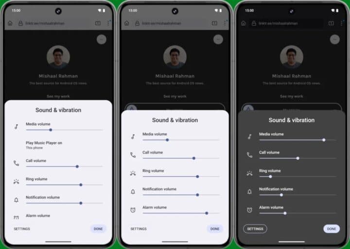 από τον Mishaal Rahman στο Android Authority, στο Android 15 Developer Preview 2, ο πίνακας ρύθμισης έντασης που εμφανίζεται όταν πατάτε το κουμπί αύξησης ή μείωσης της έντασης ήχου έχει μια ολοκαίνουργια σχεδίαση που βασίζεται στο Material You. Όπως μπορείτε να δείτε στα παρακάτω στιγμιότυπα οθόνης, σε αντίθεση με το τρέχον πάνελ που έχει ρυθμιστικά που είναι λεπτά και ευκρινή, ο νέος πίνακας προσφέρει ρυθμιστικά που είναι πολύ παχύτερα και στρογγυλότερα, που μιμούνται το σχήμα ενός χαπιού. Αυτά τα ρυθμιστικά περιέχουν επίσης το όνομα της ροής τόμου, σε αντίθεση με τον τρέχοντα πίνακα που δείχνει το όνομα της ροής τόμου πάνω από τα ρυθμιστικά.