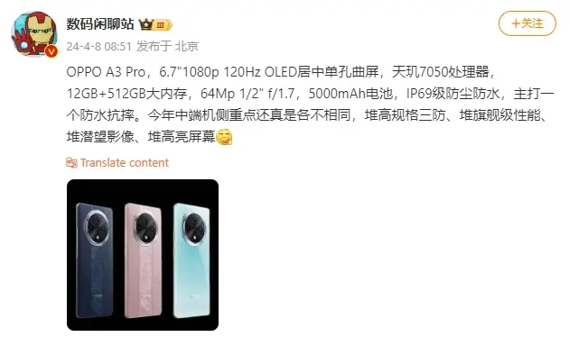 Η OPPO θα αποκαλύψει επίσης τη νέα της συσκευή στην Κίνα στις 12 Απριλίου, γνωστή ως OPPO A3 Pro. Αυτή είναι η πρώτη φορά που η εταιρεία αποκαλύπτει τις προδιαγραφές και την ημερομηνία κυκλοφορίας της συσκευής ταυτόχρονα. Αυτή η συσκευή έχει επίσης εμφανιστεί στο Geekbench, λεπτομέρειες της οποίας δίνονται παρακάτω