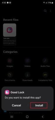 . Μόλις γίνει λήψη του αρχείου APK, ανοίξτε την εφαρμογή My Files στη συσκευή σας. Το ληφθέν αρχείο Good Lock θα εμφανιστεί στη λίστα των πρόσφατων αρχείων στο επάνω μέρος του My Files – πατήστε το και ακολουθήστε τις οδηγίες στην οθόνη για να εγκαταστήσετε την εφαρμογή.