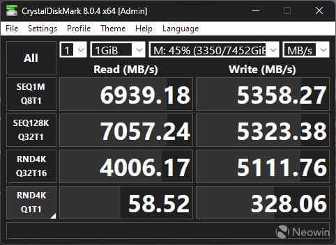Η σταθερή ταχύτητα εγγραφής, ωστόσο, δεν ταίριαζε αρκετά με τα καθορισμένα 6000 MB/s, αν και συνήθως αυτή είναι αναμενόμενη συμπεριφορά, ειδικά σε αυτήν την πυκνότητα αποθήκευσης, γι’ αυτό οι κατασκευαστές τείνουν να σημειώνουν έναν αριθμό “έως xxxxMB/s” όταν δηλώνουν και τα δύο ταχύτητες ανάγνωσης και εγγραφής.