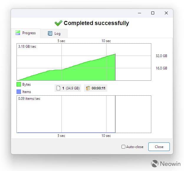 Αν και το έχουμε πει αυτό, τα 3,2 GB/s εξακολουθούν να είναι αρκετά γρήγορα, όπως δείχνει το παραπάνω στιγμιότυπο οθόνης. Το ίδιο ακριβώς αποτέλεσμα φάνηκε απλώς με μεταφορά και απόθεση του ίδιου αρχείου χρησιμοποιώντας την Εξερεύνηση αρχείων των Windows, αλλά παρατήρησα μια επαναλαμβανόμενη τυχαία παύση στα μισά του δρόμου κατά τη χρήση του Explorer.