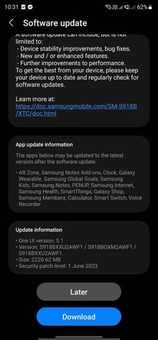 , Galaxy S23+ και Galaxy S23 Ultra φέρει την έκδοση υλικολογισμικού S91xBXXU2AWF1. Η ενημέρωση έχει τεράστιο μέγεθος αρχείου που φτάνει τα 2,2 GB, κάτι που υποδηλώνει ορισμένες σημαντικές βελτιώσεις που θα μπορούσαν να συμπεριληφθούν σε αυτήν. Η νέα ενημέρωση λογισμικού είναι προς το παρόν διαθέσιμη στην Ινδονησία, τη Μαλαισία, την Ταϊλάνδη και τις Φιλιππίνες. Ωστόσο αναμένεται να γίνει διαθέσιμη και σε διάφορες άλλες ασιατικές και ευρωπαϊκές χώρες τις επόμενες ημέρες.