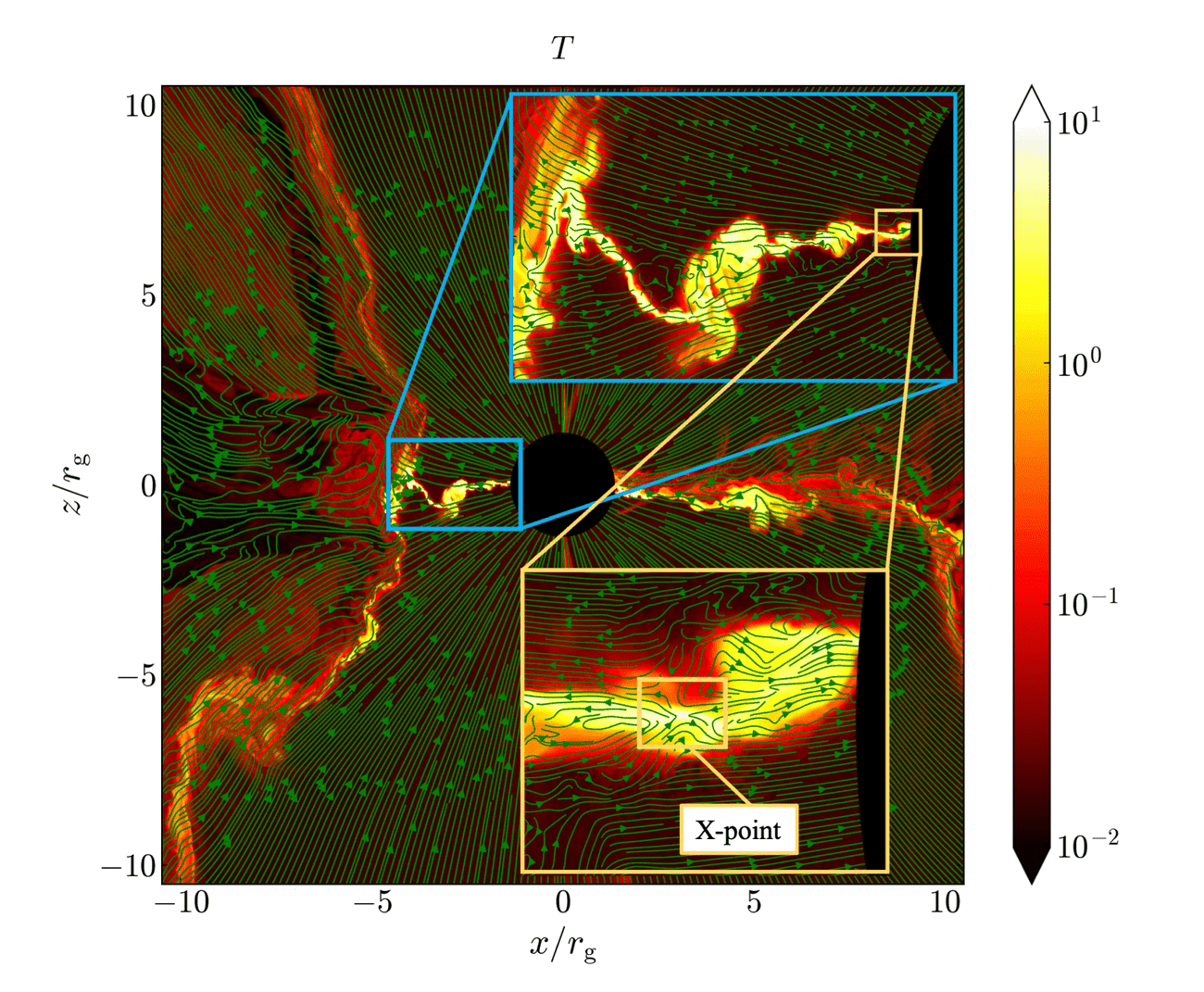 Η προσομοίωση είχε 1.000 φορές την ανάλυση προηγούμενων προσομοιώσεων και γι’ αυτό αυτή η διεργασία ήταν αόρατη έως τώρα στις προηγούμενες προσομοιώσεις. Η νέα προσομοίωση απεικόνισε με ακρίβεια τις διεργασίες των μαγνητικών πεδίων γύρω από τον ορίζοντα γεγονότων. Το υλικό που συλλέγεται από το δίσκο προσαύξησης κινείται προς τους “πόλους” της μαύρης τρύπας. Το φορτισμένο αυτό υλικό επηρεάζει τις γραμμές του μαγνητικού πεδίου οι οποίες κινούνται μαζί του. Κάποιες από αυτές τις γραμμές “σπάνε” και ενώνονται με διαφορετικές γραμμές. Σε κάποιες περιπτώσεις, ένας θύλακας με υλικό σχηματίζεται, το οποίο είναι απομονωμένο από τις εξωτερικές δυνάμεις αλλά τελικά εκτοξεύεται προς τη
