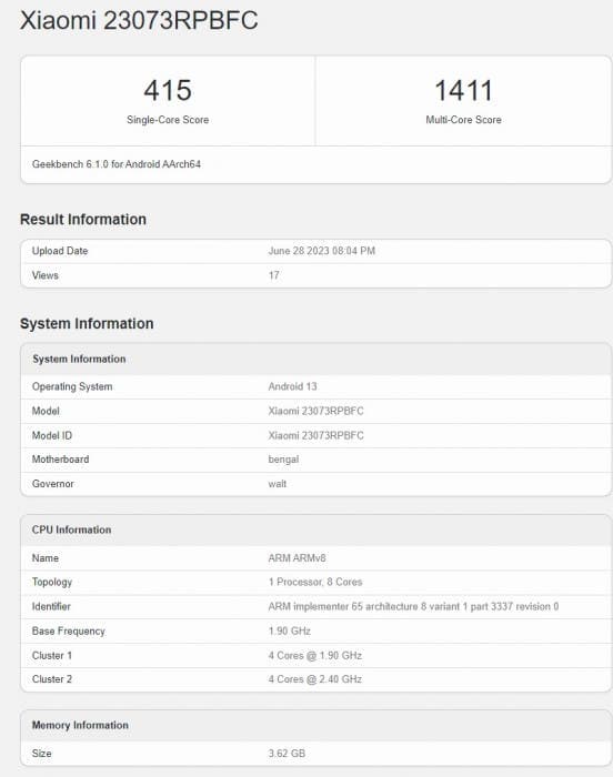 πληροφορίες για τις βασικές του προδιαγραφές. Σύμφωνα με τη λίστα στο Geekbench, η ταμπλέτα θα έχει αριθμό μοντέλου 23073RPBFC. Το Redmi Pad 2 θα τροφοδοτείται από το chipset Snapdragon 680 4G, με κωδικό όνομα μητρικής πλακέτας «Bengal». Αυτό το chipset διαθέτει τέσσερις πυρήνες υψηλής απόδοσης χρονισμένους στα 2,40 GHz και τέσσερις πυρήνες ενεργειακής απόδοσης χρονισμένους στα 1,90 GHz. Ο επεξεργαστής θα συνοδεύεται από GPU Adreno 610. Σε σύγκριση με το μοντέλο πρώτης γενιάς, αυτός ο επεξεργαστής αντιπροσωπεύει μια υποβάθμιση από το MediaTek Helio G99, το οποίο διαθέτει ελαφρώς ισχυρότερη CPU και GPU.