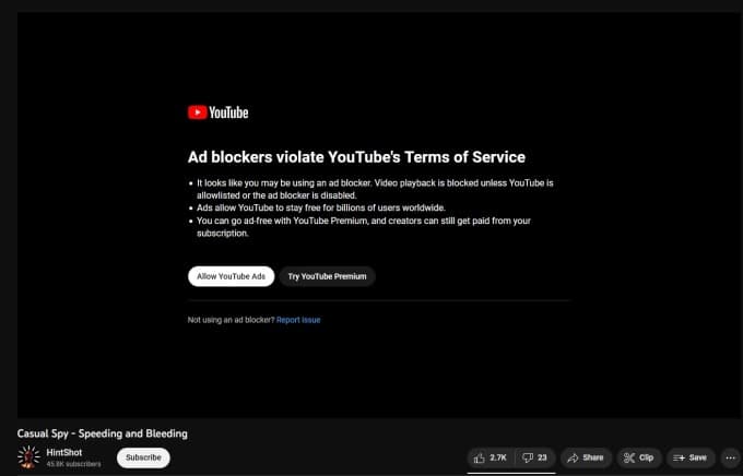 Ένας άλλος χρήστης δημοσίευσε ένα στιγμιότυπο οθόνης αφού το YouTube απέκλεισε την πρόσβαση στο βίντεο. «Οι αποκλειστές διαφημίσεων παραβιάζουν τους Όρους Παροχής Υπηρεσιών του YouTube», αναφέρει το μήνυμα. Ορισμένοι χρήστες αντιμετώπισαν περιορισμούς στο YouTube