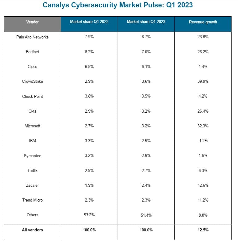 Η Palo Alto Networks, που κατέκτησε την πρωτιά της παγκόσμιας αγοράς κυβερνοασφάλειας, αναπτύχθηκε με ρυθμό 23,6% το πρώτο τρίμηνο, του 2023, αυξάνοντας το μερίδιο αγοράς της στο 8,7%. Η Fortinet αύξησε επίσης το μερίδιό της κατά 26,2%, φτάνοντας στο 7,0%.