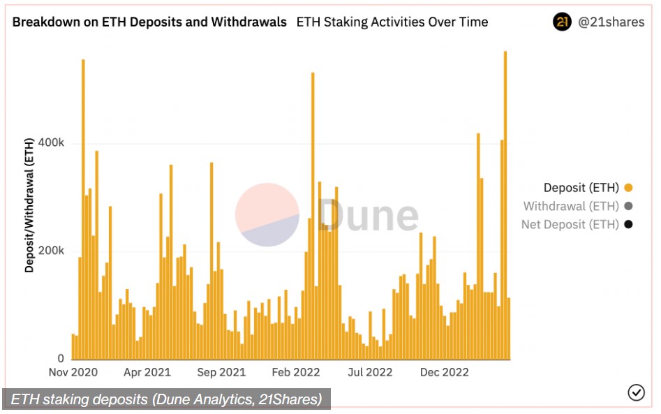 , αξίας άνω του ενός δισεκατομμυρίου δολαρίων, σύμφωνα με έναν πίνακα δεδομένων Dune Analytics και τον αναλυτή Tom Wan της εταιρείας επενδύσεων ψηφιακών περιουσιακών στοιχείων 21Shares. Πρόκειται για τη μεγαλύτερη εισροή νομισμάτων σε εβδομαδιαία βάση, από τότε που ξεκίνησε το staking του Ethereum, εδώ και δυόμισι χρόνια.