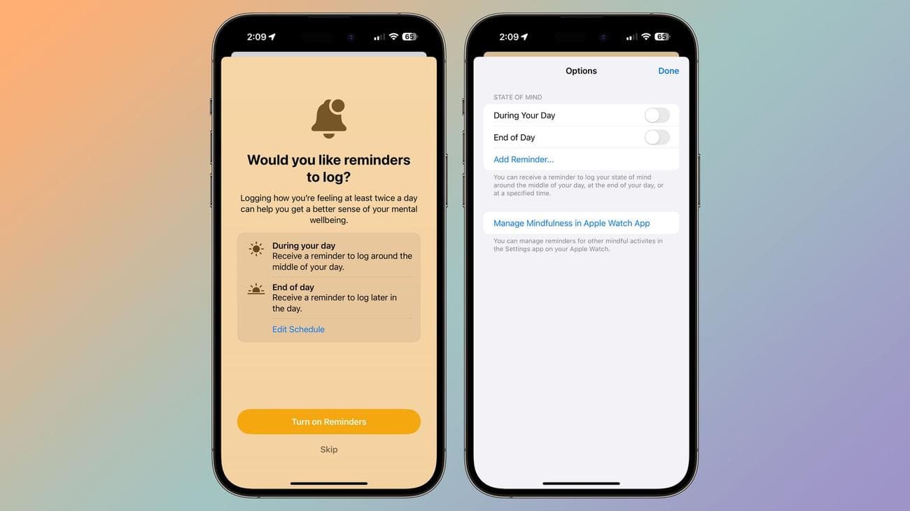 Η Apple έχει κάνει μικρές βελτιώσεις στο σχεδιασμό της ενότητας Mental Wellbeing της εφαρμογής Health, δίνοντάς της μια πιο βελτιωμένη εμφάνιση και συνδυασμό χρωμάτων. Τα χρώματα για διάφορα συναισθήματα έχουν αλλάξει και τα κουμπιά και το φόντο ταιριάζουν πλέον με την επιλογή διάθεσης.