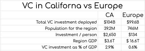 Η Ευρώπη μπορεί να βρίσκεται σε κατάσταση ταχείας ανάπτυξης, αλλά ως κατηγορία περιουσιακών στοιχείων, η VC υστερεί. Για κάθε άτομο που ζει στην Ευρώπη, 134 δολάρια επενδύονται στο τοπικό οικοσύστημα. Για την Καλιφόρνια, ο ίδιος αριθμός είναι 2.650 $.