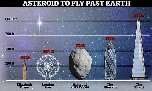 , που ονομάζεται επιστημονικά 2013 WV44, θα περάσει από τον πλανήτη μας την Τετάρτη. Εκτιμάται ότι έχει διάμετρο έως και 160 μέτρα, γεγονός που τον καθιστά μεγαλύτερο τόσο από το London Eye όσο και από το Big Ben.