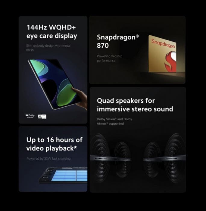 UFS 3.1. Σύμφωνα με την Xiaomi, η οθόνη έχει ανάλυση 2.880 x 1.800 pixels με 550 nits, μέγιστο ρυθμό ανανέωσης 144Hz και λόγο αντίθεσης 1.400:1. Επιπλέον, το tablet διαθέτει μπαταρία 8.840mAh που υποστηρίζει ενσύρματη φόρτιση 33W μέσω της θύρας USB 3.2 Gen 1 Type-C. Ενώ η Xiaomi δεν έχει επιβεβαιώσει την κάλυψη υποστήριξης λογισμικού, έχει δώσει δύο σημαντικές ενημερώσεις λειτουργικού συστήματος στη σειρά Pad 5. Ως εκ τούτου, φαίνεται πιθανό ότι το Pad 6 θα φτάσει έως το