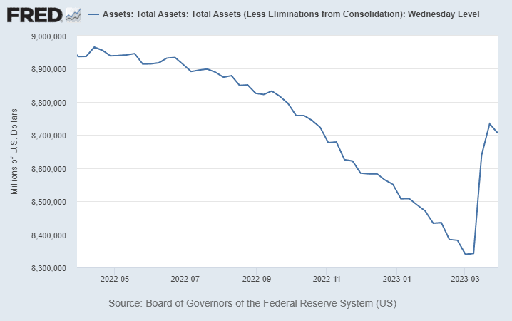 Μια που παρουσιάσαμε αρκετά διαγράμματα σήμερα, ας βάλουμε άλλο ένα, φαινομενικά άσχετο με το Bitcoin. Η πρόσφατη ενημέρωση του ισολογισμού της Fed φανερώνει πως
