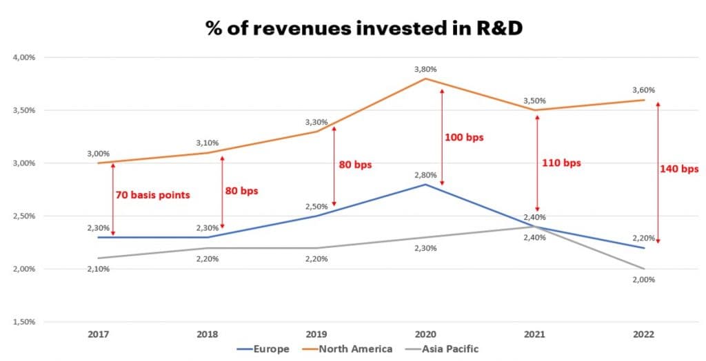 Επιπρόσθετα, αυτό το χάσμα διευρύνεται: το 2017, οι ευρωπαϊκές εταιρείες που αναλύθηκαν για τη μελέτη υστερούσαν από τις αντίστοιχες εταιρείες στη Β. Αμερική κατά 70 μονάδες βάσης όσον αφορά τις επενδύσεις R&D ως ποσοστό του κύκλου εργασιών τους. Μέχρι το 2022, αυτό το χάσμα είχε διπλασιαστεί στις 140 μονάδες βάσης, το οποίο αντιστοιχεί σε $147 δις το 2022.