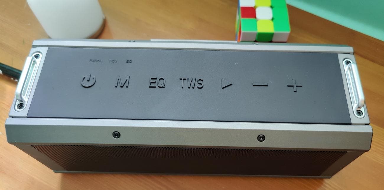 Από αριστερά προς τα δεξιά έχουμε το κουμπί της έναρξης, το οποίο πατώντας το για 1.5 δευτερόλεπτο περίπου ανοίγει το ηχείο και ξεκινά να ψάχνει συμβατές συσκευές.