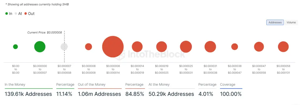 Περαιτέρω, φαίνεται ότι το μεγαλύτερο μέρος των κατόχων με απώλεια (411.390 διευθύνσεις) αγόρασε το Shiba Inu σε τιμές μεταξύ 0,000008 $ και 0,000014 $, γεγονός που καθιστά τη μέση τιμή των $0,00001 ένα σημαντικό επίπεδο αντίστασης για το SHIB.