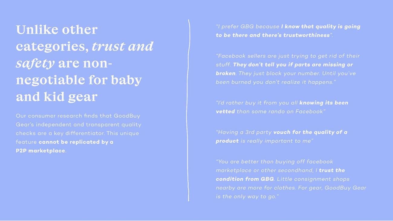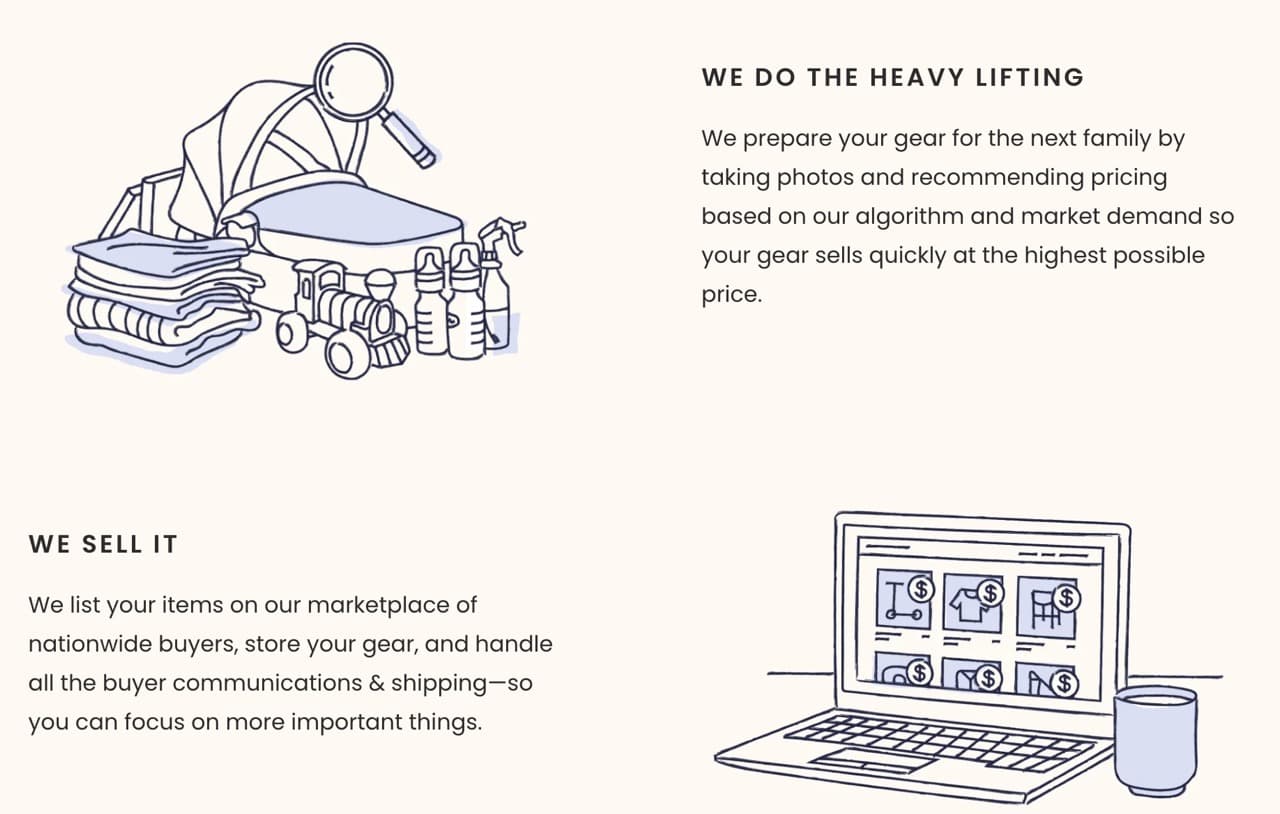 Το επιχειρηματικό μοντέλο του GoodBuy Gear διαφέρει από τα αντίστοιχα του: Ελέγχει την ποιότητα των προϊόντων και διασφαλίζει ότι είναι καθαρά και υψηλής ποιότητας. Οι πολυάσχολοι γονείς δεν έχουν χρόνο να ασχοληθούν με το να πάνε στο ταχυδρομείο, να ασχοληθούν με τις επιστροφές, επομένως αυτή η υπηρεσία εξαλείφει πολλή ταλαιπωρία. Η αφήγηση αυτού του μέρους της ιστορίας μέσω μαρτυριών πελατών είναι έξυπνη. Ενώ μισώ αυτόν τον τοίχο κειμένου με λευκό σε ανοιχτό μπλε, μεταδίδει το «γιατί» του μηνύματος.