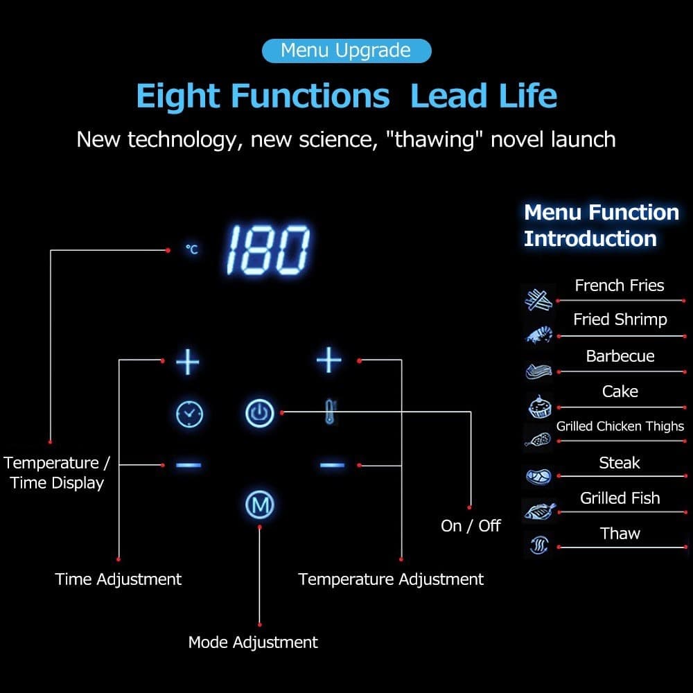για πατάτες, κοτόπουλο, ψάρι, γλυκά, μπριζόλες κ.α. με όλο τον έλεγχο της να γίνεται μέσω των πλήκτρων αφής στην κορυφή της αεροφριτέζας.