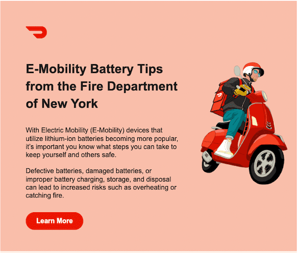 Η DoorDash είπε στο TechCrunch ότι λειτουργεί επίσης για την ευαισθητοποίηση, στέλνοντας τακτικά συμβουλές πυρασφάλειας μπαταρίας. Η σελίδα προορισμού της εταιρείας για τα ποδήλατα Dashers περιλαμβάνει επίσης συνδέσμους προς