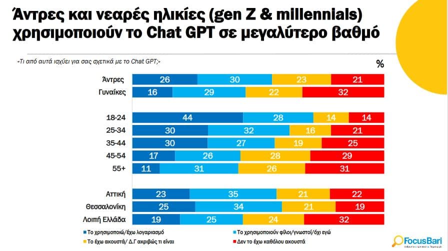 να είναι πιο θετικοί στη χρήση του ChatGPT. Αντίθετα η στάση που κρατούν οι γυναίκες σαφώς πιο επιφυλακτική.
