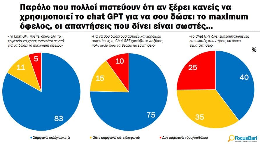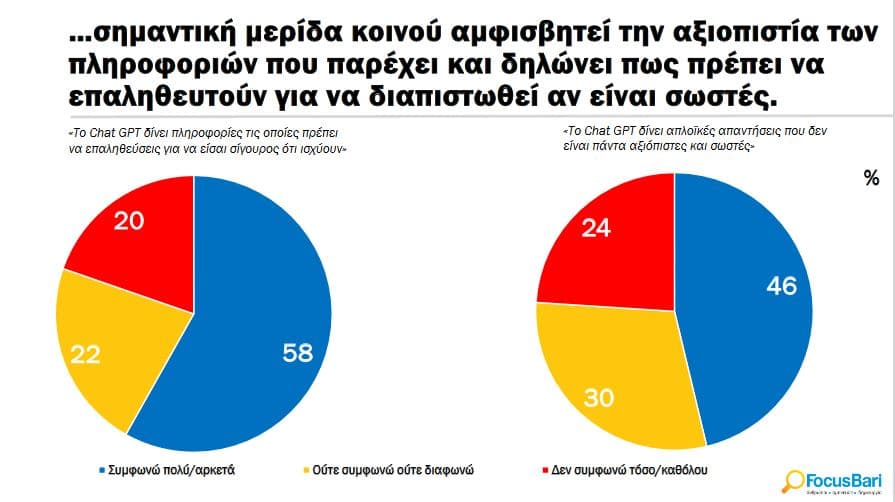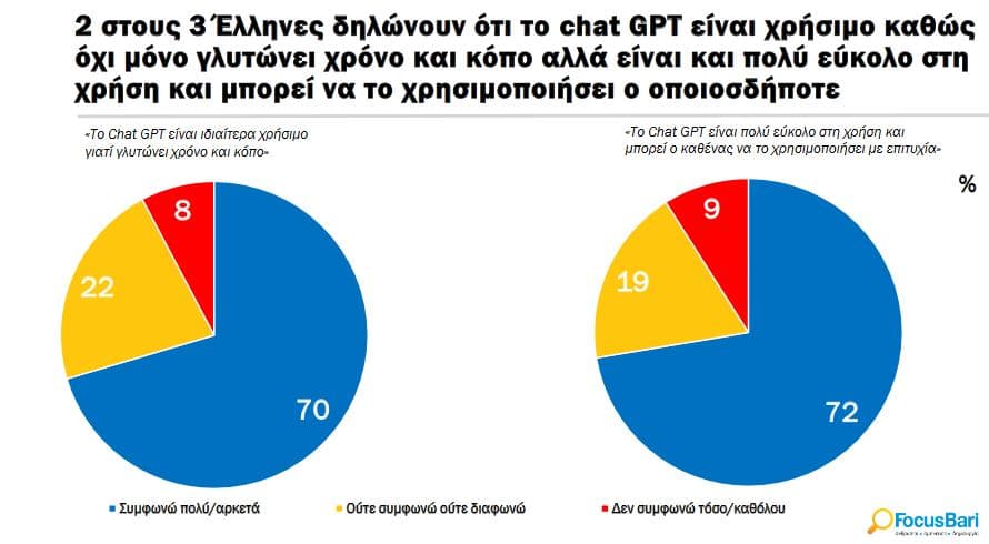 με τίτλο «Οι Έλληνες & το ChatGPT» που διεξήχθηκε τον Ιούλιο του 2023 έδειξε ότι oι Έλληνες είναι ακόμα μοιρασμένοι ως προς το πως θα επηρεάσει το ΑΙ την κοινωνία, με την πλειοψηφία να είναι ακόμα επιφυλακτική.