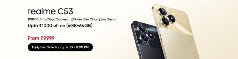 Το Realme C53 για την Ινδία είναι σε προπαραγγελία, ξεκινώντας από 10.000 ₹. Οι πωλήσεις θα ξεκινήσουν στις 26 Ιουλίου και θα περιλαμβάνουν το ηλεκτρονικό κατάστημα της Realme, το Flipkart καθώς και offline καταστήματα.