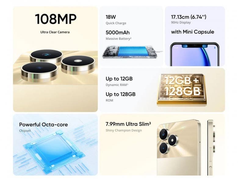 Όπως έδειξαν οι πρώτες λεπτομέρειες, το νέο C53 διαθέτει κύρια κάμερα 108MP, αντικαθιστώντας την κάμερα 50MP του αρχικού C53. Ακόμη και το C55 έχει μόνο μια κύρια κάμερα 64MP. Η επιπλέον ανάλυση δίνει στο νέο τηλέφωνο 3x zoom. Όπως και στο C55, δεν υπάρχει κάμερα υπερευρείας γωνίας. Ωστόσο, υπάρχει μια selfie κάμερα 8MP, σε αυτό που η Realme αποκαλεί «μίνι κάψουλα» – η άποψη της εταιρείας για το Dynamic Island UI. Σημειώστε ότι αυτό βρίσκεται σε μια εγκοπή και όχι σε μια οπή. Το παλιό C53 και το νέο C53 έχουν μπαταρίες 5.000 mAh. Ωστόσο, αυτό έχει πιο αργή φόρτιση στα 18W, από 33W. Τα υπόλοιπα είναι σχεδόν πανομοιότυπα με αυτά που είδαμε τον Μάιο.
