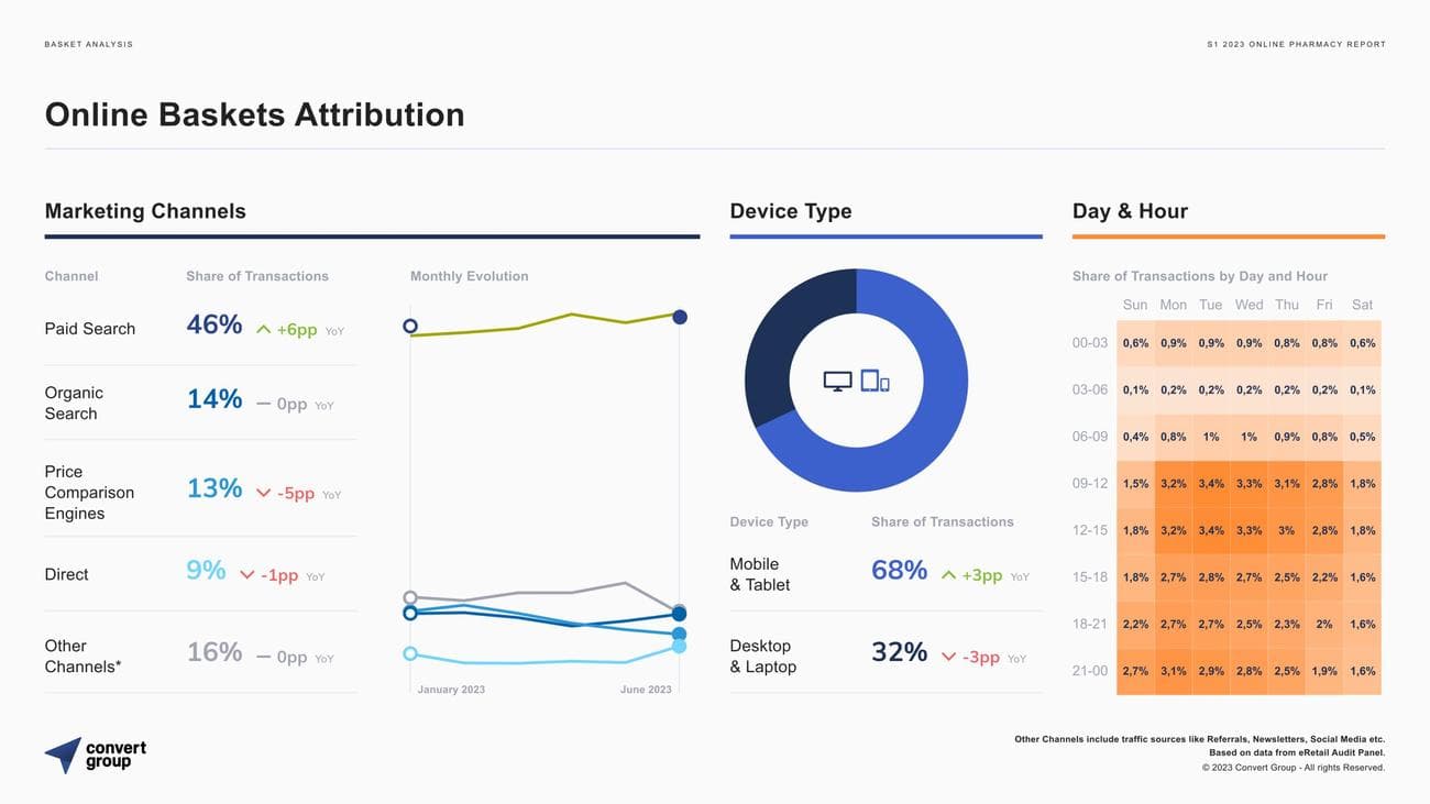 εξακολουθούν να βρίσκονται στην πρώτη θέση επιφέροντας το 46% των συνολικών συναλλαγών και σημειώνοντας αύξηση 6 μονάδων συγκριτικά με το προηγούμενο έτος. Τα Οργανικά Αποτελέσματα βρίσκονται στα ίδια επίπεδα με 14%. Ενδιαφέρον είναι το γεγονός ότι οι Πλατφόρμες Σύγκρισης Τιμών γνώρισαν μια μείωση της τάξης του 5%, έχοντας ποσοστό 13% από 18% σε σχέση με την αντίστοιχη περίοδο του 2022.