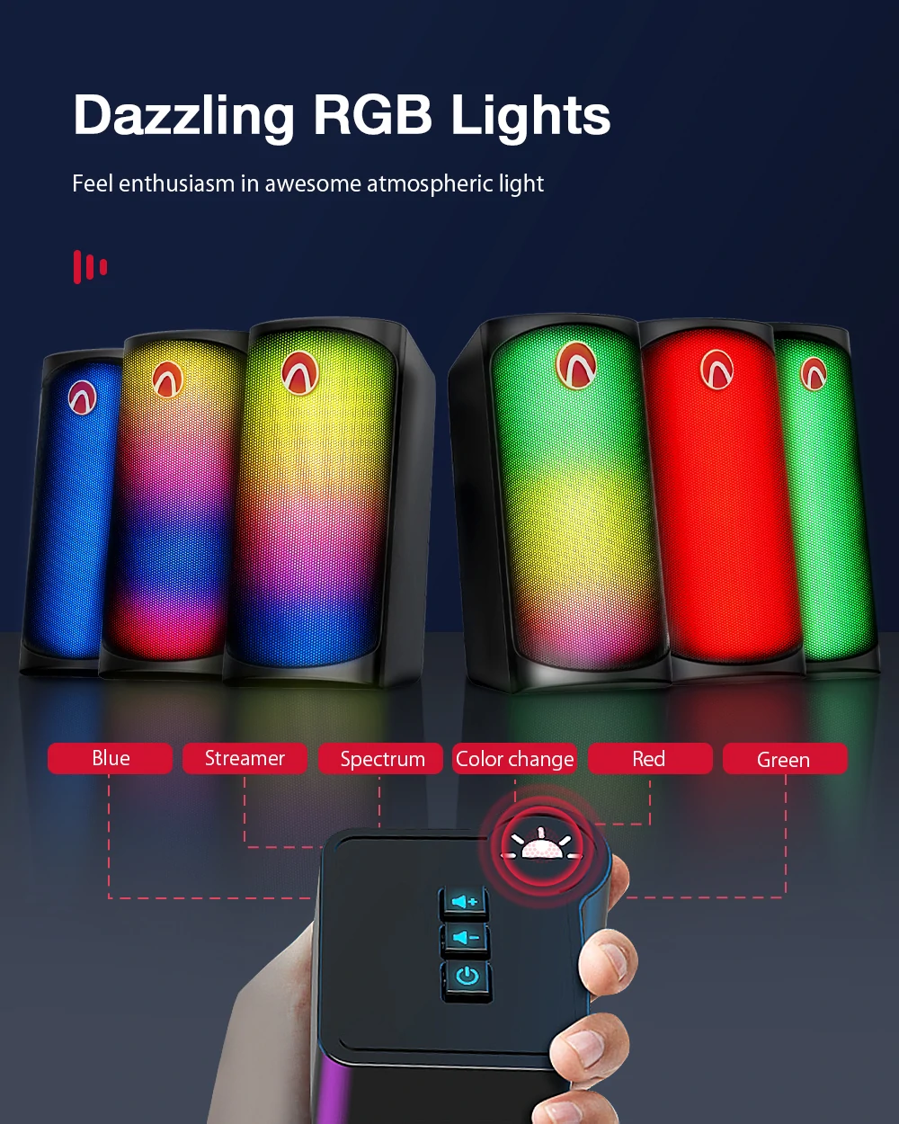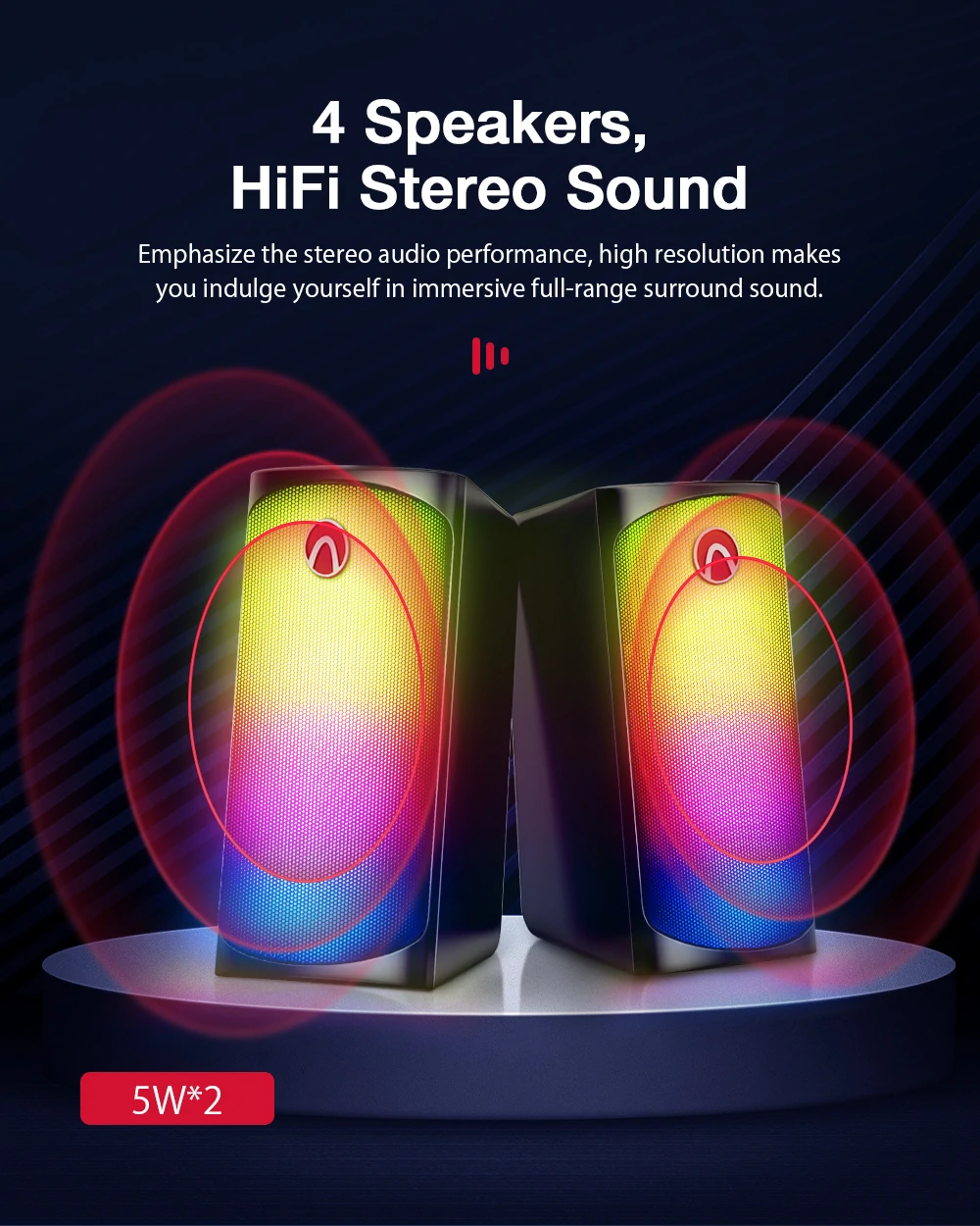 Ολη η πρόσοψη των δύο ηχείων, είναι καλυμμένη απο LEDs, με την Blitzowolf να προσφέρει 6 προεπιλεγμένα light Modes, τα οποία μπορείτε να ρυθμίσετε με το ενσωματωμένο, στο καλώδιο,