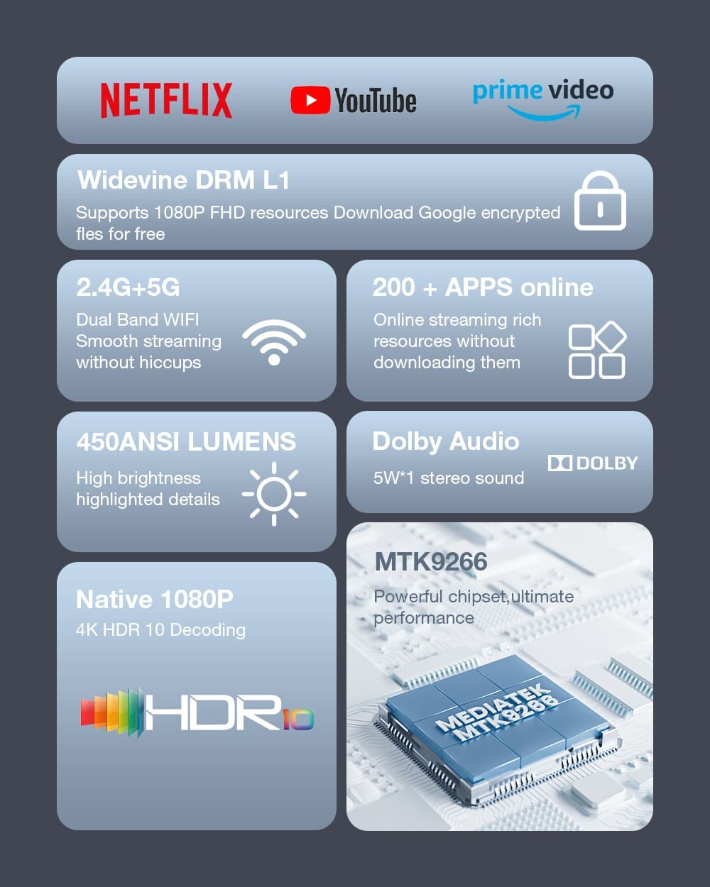O BlitzWolf BW-V6 μπορεί να προβάλει εικόνα με Native Full HD ανάλυση, και HDR10 Decoding, με τη λάμπα του να σας προσφέρει μέγιστη φωτεινότητα 450 ANSI Lumens. To Focus και το Keystone ρυθμίζονται χειροκίνητα, μέσω δύο περιστροφικών επιλογέων πίσω απο τον φακό, ενώ δεν λείπει το ενσωματωμένο ηχείο 5W, με υποστήριξη Dolby(τι Dolby τώρα, με μονοφωνικό ηχείο, ένας Θεός ξέρει) , το Dual Band WiFi και το Bluetooth.