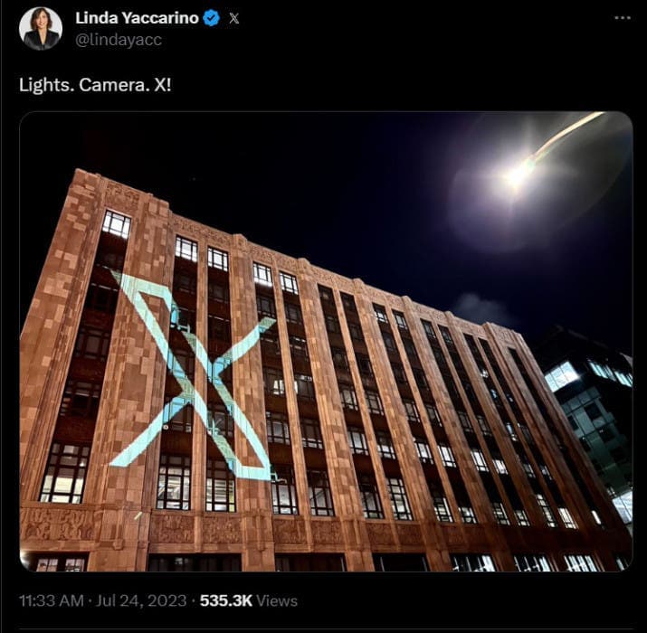 Η διευθύνουσα σύμβουλος του Twitter, Linda Yaccarino, αποκάλυψε το νέο λογότυπο Twitter σε μια ανάρτηση τη Δευτέρα, εκφράζοντας τον ενθουσιασμό της με τη δήλωση «το X είναι εδώ! Ας το κάνουμε». Μοιράστηκε επίσης μια ανάρτηση με τη λεζάντα «Lights. Camera. X!” και μια εικόνα του λογότυπου X που εμφανίζεται στο κτίριο της έδρας τους. Η Yaccarino περιέγραψε την απόφαση να αλλάξει το όνομα του Twitter ως μια ευκαιρία για μια «δεύτερη ευκαιρία». Τόνισε ότι το X.com θα μεταμορφώσει περαιτέρω την παγκόσμια κοινή γνώμη, βασιζόμενη στη σημαντική επίδραση που έχει ήδη κάνει το Twitter στον κόσμο της επικοινωνίας. Ο Μασκ υποσχέθηκε ότι αν δημοσιευόταν ένα συναρπαστικό λογότυπο X στο Twitter, το rebranding θα κυκλοφορούσε παγκοσμίως τη Δευτέρα 24 Ιουλίου. Αυτό πρόσθεσε ένα διαδραστικό στοιχείο στην ανακοίνωση, ενθαρρύνοντας τους χρήστες να συμμετάσχουν στη διαμόρφωση της νέας ταυτότητας. Στελέχη της εταιρείας επιβεβαίωσαν ότι η Twitter Inc. μετονομάστηκε επίσημα σε X Corp. στην Πολιτεία της Νεβάδα, με έδρα το Σαν Φρανσίσκο της Καλιφόρνια.