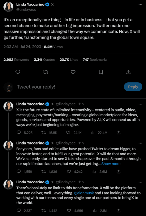Ανακοινώνοντας τις ενημερώσεις, η Linda Yaccarino, CEO του Twitter, είπε: «Το X αντιπροσωπεύει το μέλλον της απεριόριστης συνδεσιμότητας, που περιλαμβάνει ήχο, βίντεο, μηνύματα και τραπεζικές συναλλαγές για τη δημιουργία μιας παγκόσμιας αγοράς για ιδέες, αγαθά, υπηρεσίες και ευκαιρίες. Με τη δύναμη του AI, το X θα μας συνδέσει με τρόπους που δεν έχουμε ακόμη φανταστεί. Για χρόνια, το Twitter καλείται να κάνει μεγαλύτερα όνειρα και να καινοτομεί γρηγορότερα για να αξιοποιήσει πλήρως τις δυνατότητές του. Το Χ είναι η πραγματοποίηση αυτού του δυναμικού και όχι μόνο. Τους τελευταίους 8 μήνες, είδαμε το X να παίρνει σάρκα και οστά μέσα από γρήγορες εκδόσεις χαρακτηριστικών, αλλά αυτή είναι μόνο η αρχή. Δεν υπάρχουν όρια σε αυτόν τον μετασχηματισμό. Το X θα είναι η πλατφόρμα που θα προσφέρει τα πάντα. Ο Έλον Μασκ και εγώ είμαστε ενθουσιασμένοι που συνεργαζόμαστε με τις ομάδες και τους συνεργάτες μας για να φέρουμε το X στον κόσμο.»