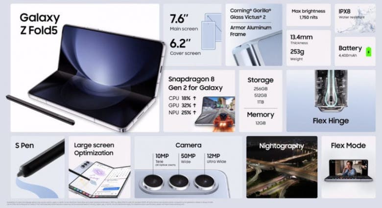 Z Fold5, το πτυσσόμενο τηλέφωνο επόμενης γενιάς της εταιρείας, στην έκθεσή της στη Νότια Κορέα. Η οθόνη Infinity Flex Dynamic AMOLED 2X 7,6 ιντσών στο εσωτερικό με προσαρμοστικό ρυθμό ανανέωσης 120 Hz είναι τώρα 30% φωτεινότερη σε έως και 1750 nits. Εξακολουθεί να χρησιμοποιεί την κάμερα κάτω από την οθόνη 4MP (UDC). Διαθέτει εξωτερική οθόνη HD+ Dynamic AMOLED 6,2 ιντσών που διαθέτει επίσης προσαρμοστικό ρυθμό ανανέωσης 120 Hz. Το Snapdragon 8+ Gen 1 στο Z Fold4 αντικαθίσταται από το Snapdragon 8 Gen 2 for Galaxy. Το τηλέφωνο διαθέτει τον ίδιο αισθητήρα 50MP, κάμερα εξαιρετικά ευρείας εμβέλειας 12MP και τηλεφακό 10MP με οπτικό zoom 3X και zoom χώρου 30X.