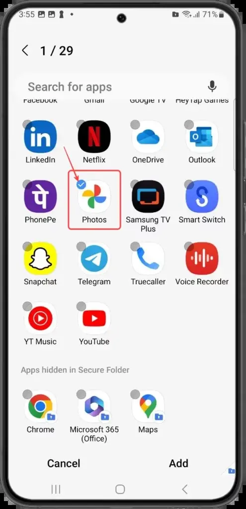 - Τώρα επιλέξτε τις εφαρμογές που θέλετε να προσθέσετε στον ασφαλή φάκελο.
