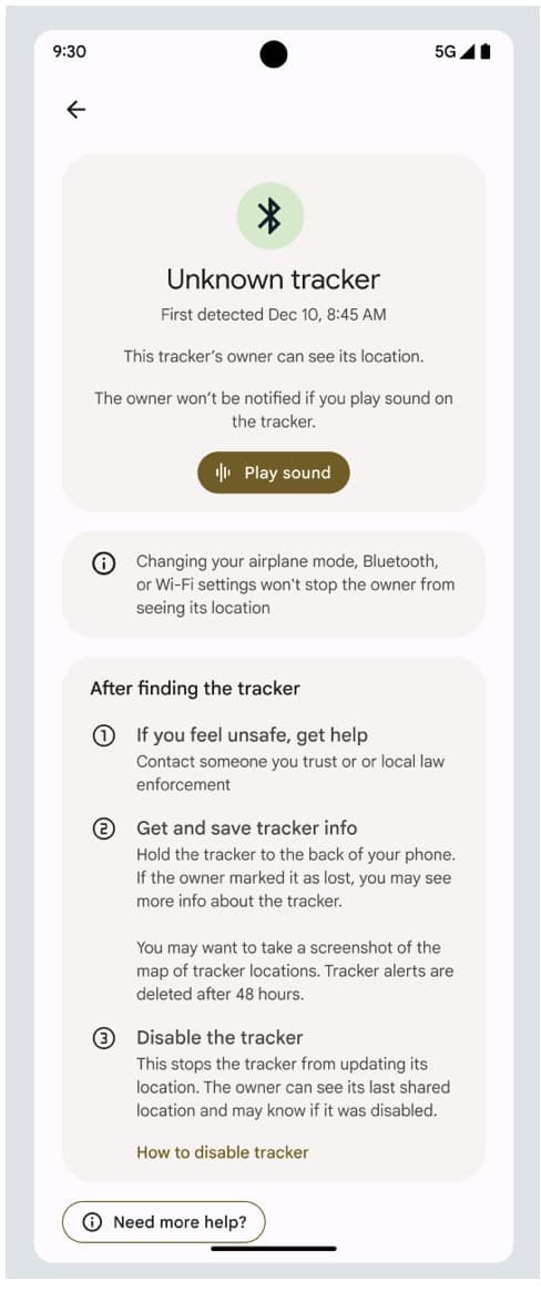 AirTag ή άλλη συσκευή παρακολούθησης Bluetooth. Οι χρήστες θα μπορούν επίσης να πραγματοποιούν χειροκίνητη σάρωση για ιχνηλάτες με τη συσκευή τους Android και να καθοδηγούνται σε συμβουλές σχετικά με το τι πρέπει να κάνουν στη συνέχεια εάν βρεθεί συσκευή παρακολούθησης.