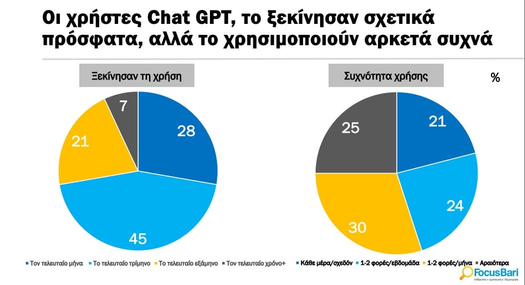 Μπορεί το 1/5 των Ελλήνων χρησιμοποιεί το ChatGPT έχοντας λογαριασμό στην εφαρμογή, ωστόσο, την ίδια στιγμή ένας στους τρεις χρήστες δεν γνωρίζει καν τι είναι. Αν και οι Έλληνες χρήστες ανακάλυψαν μόλις πρόσφατα την τεχνητή νοημοσύνη και τη δημοφιλή πλατφόρμα ChatGPT, τη χρησιμοποιούν ήδη αρκετά συχνά.