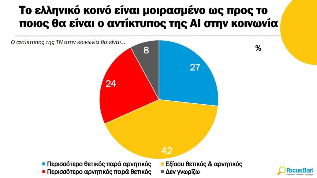 Την ίδια στιγμή, περίπου ένας στους τρεις (το 27%) εκτιμά ότι ο αντίκτυπος θα είναι μάλλον θετικός, ενώ ένα 24% απαντά ότι αναμένει μάλλον αρνητικό αντίκτυπο. Οι άντρες δείχνουν να έχουν μια πιο θετική στάση έναντι στην τεχνητή νοημοσύνη σε σύγκριση με τις γυναίκες, ενώ δεν παρατηρούνται σημαντικές διαφορές μεταξύ ηλικιών και περιοχών ανά την Ελλάδα.