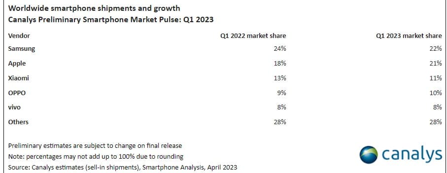 Η Samsung ήταν ο μόνος κορυφαίος προμηθευτής που πέτυχε ανάκαμψη των πωλήσεών της σε επίπεδο τριμήνου και επέστρεψε στην πρώτη θέση της παγκόσμιας αγορά με μερίδιο 22%. Εν τω μεταξύ, η Apple διολίσθησε στη δεύτερη θέση με μερίδιο αγοράς 21%, μειώνοντας τη διαφορά μεταξύ της ίδιας και της Samsung, λόγω της μεγάλης ζήτησης για τη σειρά iPhone 14 Pro το 1ο τρίμηνο του 2023.