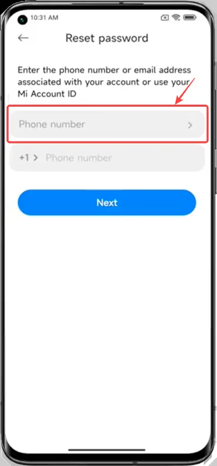 - Εδώ πρέπει να εισαγάγετε είτε τον αριθμό τηλεφώνου, το αναγνωριστικό email ή το αναγνωριστικό λογαριασμού Mi.