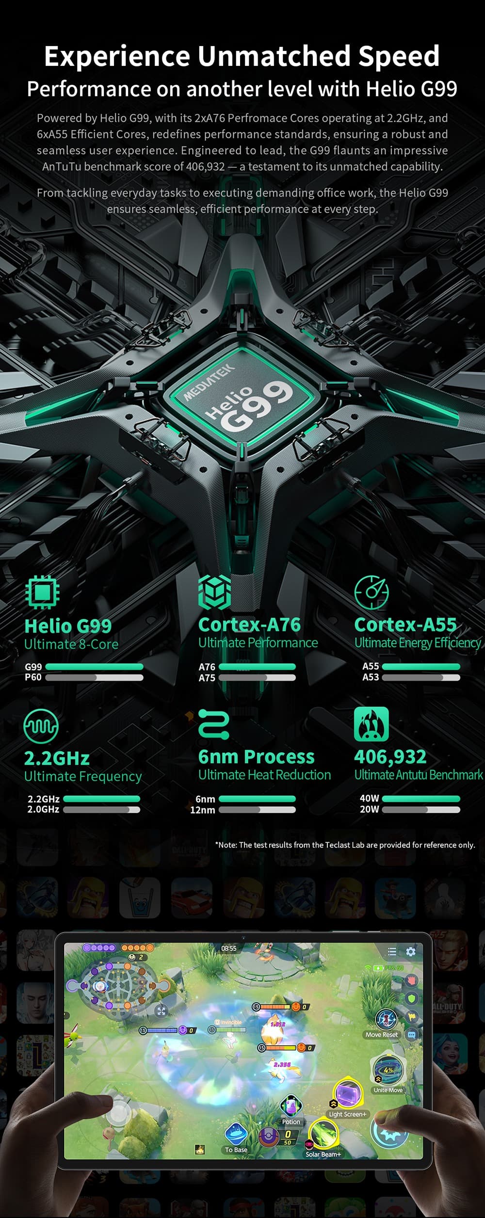 Η CPU του SoC της Mediatek έχει σχεδόν 60% καλύτερες επιδόσεις απο τους κλασσικούς Unisoc Tiger T618 που βρίσκουμε συνήθως στα Tablets της κατηγορίας, ενώ η GPU έχει σχεδόν τις διπλάσιες επιδόσεις!